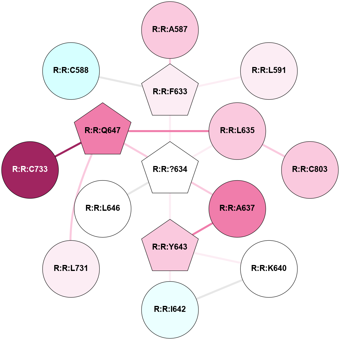 (Click to enlarge 🔍) | | Node1 | Node2 | LinkStrength | Comm | IsNode1Hub? | IsNode2Hub? | Node1Cons | Node2Cons | Node1Shell | Node2Shell | | R:R:A587 | R:R:F633 | 4.16 | 0 | No | Yes | 7 | 6 | 2 | 1 | | R:R:F633 | R:R:L591 | 3.65 | 0 | Yes | No | 6 | 6 | 1 | 2 | | R:R:?634 | R:R:F633 | 3.12 | 1 | Yes | Yes | 5 | 6 | 0 | 1 | | R:R:?634 | R:R:L635 | 3.54 | 1 | Yes | No | 5 | 7 | 0 | 1 | | R:R:?634 | R:R:A637 | 4.03 | 1 | Yes | No | 5 | 8 | 0 | 1 | | R:R:?634 | R:R:Y643 | 7 | 1 | Yes | Yes | 5 | 7 | 0 | 1 | | R:R:?634 | R:R:L646 | 3.54 | 1 | Yes | No | 5 | 5 | 0 | 1 | | R:R:?634 | R:R:Q647 | 9.08 | 1 | Yes | Yes | 5 | 8 | 0 | 1 | | R:R:L635 | R:R:Q647 | 10.65 | 1 | No | Yes | 7 | 8 | 1 | 1 | | R:R:C803 | R:R:L635 | 6.35 | 1 | No | No | 7 | 7 | 2 | 1 | | R:R:A637 | R:R:Y643 | 5.34 | 1 | No | Yes | 8 | 7 | 1 | 1 | | R:R:I642 | R:R:K640 | 4.36 | 1 | No | No | 4 | 5 | 2 | 2 | | R:R:K640 | R:R:Y643 | 4.78 | 1 | No | Yes | 5 | 7 | 2 | 1 | | R:R:I642 | R:R:Y643 | 3.63 | 1 | No | Yes | 4 | 7 | 2 | 1 | | R:R:L731 | R:R:Q647 | 3.99 | 0 | No | Yes | 6 | 8 | 2 | 1 | | R:R:C733 | R:R:Q647 | 6.1 | 0 | No | Yes | 9 | 8 | 2 | 1 | | R:R:C588 | R:R:F633 | 2.79 | 0 | No | Yes | 3 | 6 | 2 | 1 | |