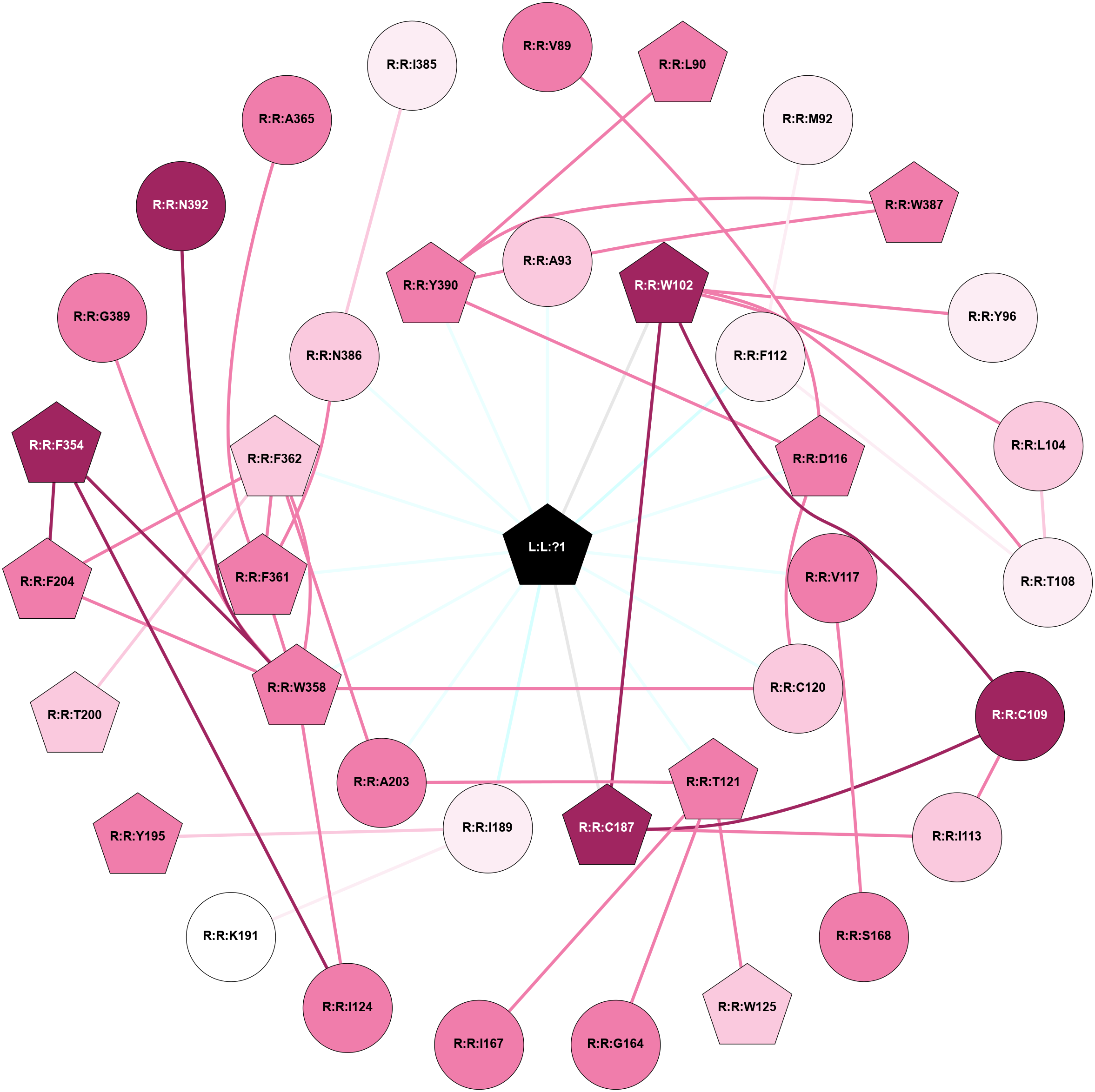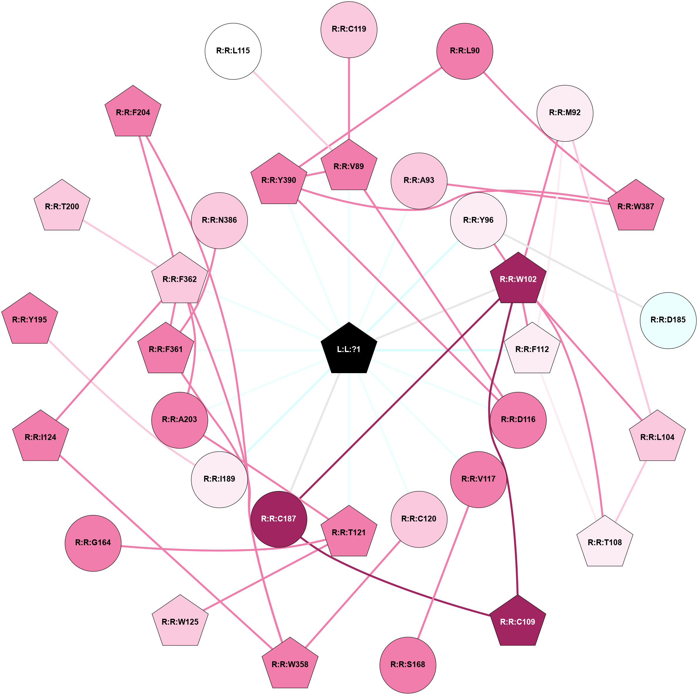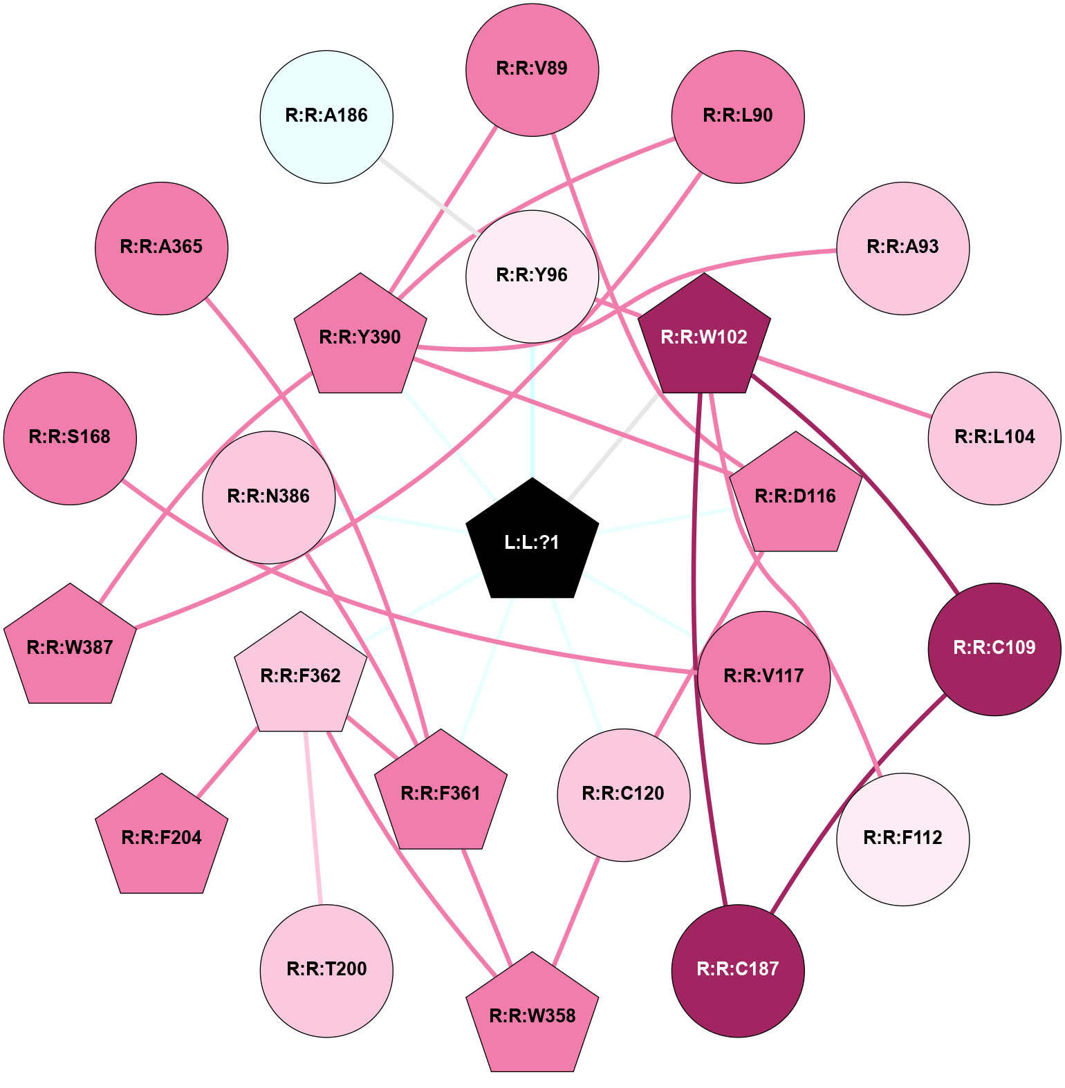 (Click to enlarge 🔍) | | Node1 | Node2 | LinkStrength | Comm | IsNode1Hub? | IsNode2Hub? | Node1Cons | Node2Cons | Node1Shell | Node2Shell | | L:L:?1 | R:R:Y96 | 9.2 | 1 | Yes | No | 0 | 6 | 0 | 1 | | L:L:?1 | R:R:W102 | 5.21 | 1 | Yes | Yes | 0 | 9 | 0 | 1 | | L:L:?1 | R:R:D116 | 16.86 | 1 | Yes | Yes | 0 | 8 | 0 | 1 | | L:L:?1 | R:R:V117 | 8.77 | 1 | Yes | No | 0 | 8 | 0 | 1 | | L:L:?1 | R:R:C120 | 5.19 | 1 | Yes | No | 0 | 7 | 0 | 1 | | L:L:?1 | R:R:F361 | 16.72 | 1 | Yes | Yes | 0 | 8 | 0 | 1 | | L:L:?1 | R:R:F362 | 7.96 | 1 | Yes | Yes | 0 | 7 | 0 | 1 | | L:L:?1 | R:R:N386 | 8.08 | 1 | Yes | No | 0 | 7 | 0 | 1 | | L:L:?1 | R:R:Y390 | 10.73 | 1 | Yes | Yes | 0 | 8 | 0 | 1 | | R:R:D116 | R:R:V89 | 11.69 | 1 | Yes | No | 8 | 8 | 1 | 2 | | R:R:V89 | R:R:Y390 | 3.79 | 1 | No | Yes | 8 | 8 | 2 | 1 | | R:R:L90 | R:R:W387 | 4.56 | 1 | No | Yes | 8 | 8 | 2 | 2 | | R:R:L90 | R:R:Y390 | 9.38 | 1 | No | Yes | 8 | 8 | 2 | 1 | | R:R:A93 | R:R:Y390 | 5.34 | 0 | No | Yes | 7 | 8 | 2 | 1 | | R:R:W102 | R:R:Y96 | 5.79 | 1 | Yes | No | 9 | 6 | 1 | 1 | | R:R:L104 | R:R:W102 | 12.53 | 0 | No | Yes | 7 | 9 | 2 | 1 | | R:R:C109 | R:R:W102 | 9.14 | 1 | No | Yes | 9 | 9 | 2 | 1 | | R:R:F112 | R:R:W102 | 5.01 | 0 | No | Yes | 6 | 9 | 2 | 1 | | R:R:C187 | R:R:W102 | 16.98 | 1 | No | Yes | 9 | 9 | 2 | 1 | | R:R:C109 | R:R:C187 | 7.28 | 1 | No | No | 9 | 9 | 2 | 2 | | R:R:C120 | R:R:D116 | 4.67 | 1 | No | Yes | 7 | 8 | 1 | 1 | | R:R:D116 | R:R:Y390 | 11.49 | 1 | Yes | Yes | 8 | 8 | 1 | 1 | | R:R:C120 | R:R:W358 | 5.22 | 1 | No | Yes | 7 | 8 | 1 | 2 | | R:R:F362 | R:R:T200 | 5.19 | 1 | Yes | No | 7 | 7 | 1 | 2 | | R:R:F204 | R:R:F362 | 20.36 | 1 | Yes | Yes | 8 | 7 | 2 | 1 | | R:R:F361 | R:R:W358 | 8.02 | 1 | Yes | Yes | 8 | 8 | 1 | 2 | | R:R:F362 | R:R:W358 | 9.02 | 1 | Yes | Yes | 7 | 8 | 1 | 2 | | R:R:F361 | R:R:F362 | 13.93 | 1 | Yes | Yes | 8 | 7 | 1 | 1 | | R:R:F361 | R:R:N386 | 4.83 | 1 | Yes | No | 8 | 7 | 1 | 1 | | R:R:W387 | R:R:Y390 | 8.68 | 1 | Yes | Yes | 8 | 8 | 2 | 1 | | R:R:S168 | R:R:V117 | 3.23 | 0 | No | No | 8 | 8 | 2 | 1 | | R:R:A365 | R:R:F361 | 2.77 | 0 | No | Yes | 8 | 8 | 2 | 1 | | R:R:A186 | R:R:Y96 | 1.33 | 0 | No | No | 4 | 6 | 2 | 1 | |