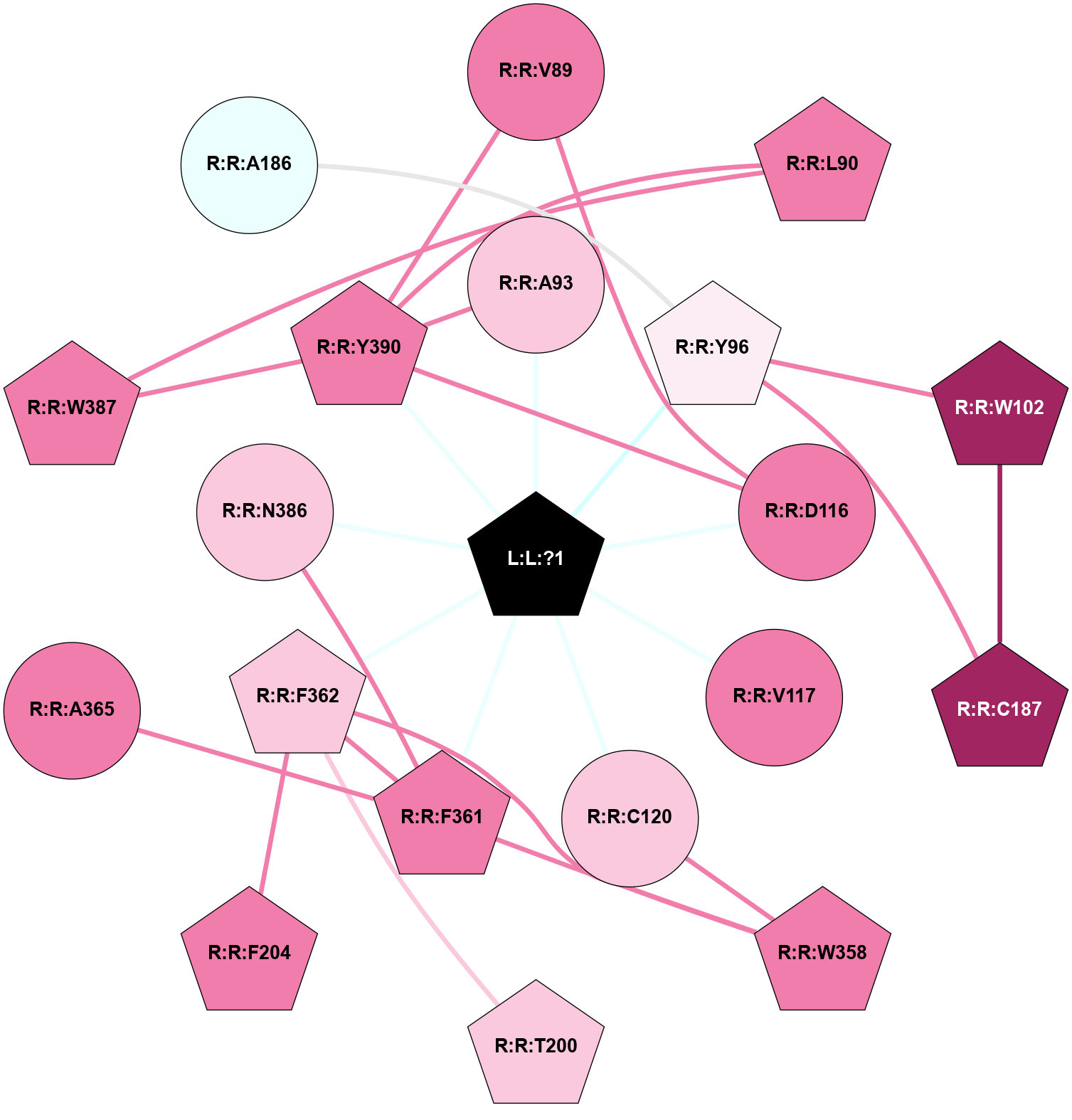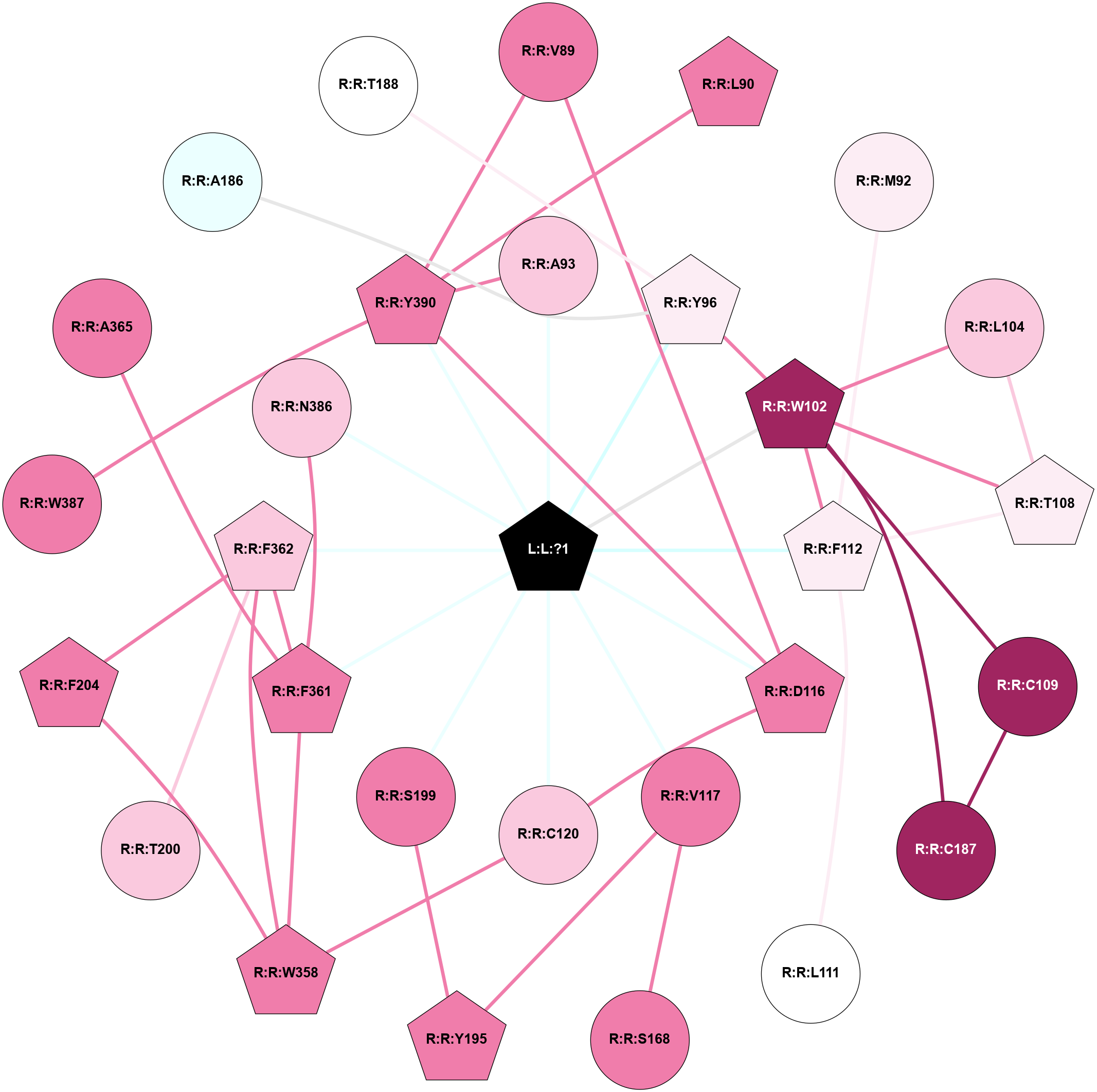 (Click to enlarge 🔍) | | Node1 | Node2 | LinkStrength | Comm | IsNode1Hub? | IsNode2Hub? | Node1Cons | Node2Cons | Node1Shell | Node2Shell | | L:L:?1 | R:R:A93 | 6.18 | 1 | Yes | No | 0 | 7 | 0 | 1 | | L:L:?1 | R:R:Y96 | 9.96 | 1 | Yes | Yes | 0 | 6 | 0 | 1 | | L:L:?1 | R:R:D116 | 22.18 | 1 | Yes | No | 0 | 8 | 0 | 1 | | L:L:?1 | R:R:V117 | 14.61 | 1 | Yes | No | 0 | 8 | 0 | 1 | | L:L:?1 | R:R:C120 | 4.15 | 1 | Yes | No | 0 | 7 | 0 | 1 | | L:L:?1 | R:R:F361 | 15.13 | 1 | Yes | Yes | 0 | 8 | 0 | 1 | | L:L:?1 | R:R:F362 | 4.78 | 1 | Yes | Yes | 0 | 7 | 0 | 1 | | L:L:?1 | R:R:N386 | 8.98 | 1 | Yes | No | 0 | 7 | 0 | 1 | | L:L:?1 | R:R:Y390 | 9.2 | 1 | Yes | Yes | 0 | 8 | 0 | 1 | | R:R:D116 | R:R:V89 | 11.69 | 1 | No | No | 8 | 8 | 1 | 2 | | R:R:V89 | R:R:Y390 | 3.79 | 1 | No | Yes | 8 | 8 | 2 | 1 | | R:R:L90 | R:R:W387 | 5.69 | 1 | Yes | Yes | 8 | 8 | 2 | 2 | | R:R:L90 | R:R:Y390 | 11.72 | 1 | Yes | Yes | 8 | 8 | 2 | 1 | | R:R:A93 | R:R:Y390 | 4 | 1 | No | Yes | 7 | 8 | 1 | 1 | | R:R:W102 | R:R:Y96 | 10.61 | 1 | Yes | Yes | 9 | 6 | 2 | 1 | | R:R:C187 | R:R:Y96 | 4.03 | 1 | Yes | Yes | 9 | 6 | 2 | 1 | | R:R:C187 | R:R:W102 | 16.98 | 1 | Yes | Yes | 9 | 9 | 2 | 2 | | R:R:D116 | R:R:Y390 | 11.49 | 1 | No | Yes | 8 | 8 | 1 | 1 | | R:R:C120 | R:R:W358 | 5.22 | 0 | No | Yes | 7 | 8 | 1 | 2 | | R:R:F362 | R:R:T200 | 5.19 | 1 | Yes | Yes | 7 | 7 | 1 | 2 | | R:R:F204 | R:R:F362 | 20.36 | 0 | Yes | Yes | 8 | 7 | 2 | 1 | | R:R:F361 | R:R:W358 | 7.02 | 1 | Yes | Yes | 8 | 8 | 1 | 2 | | R:R:F362 | R:R:W358 | 8.02 | 1 | Yes | Yes | 7 | 8 | 1 | 2 | | R:R:F361 | R:R:F362 | 16.08 | 1 | Yes | Yes | 8 | 7 | 1 | 1 | | R:R:A365 | R:R:F361 | 4.16 | 0 | No | Yes | 8 | 8 | 2 | 1 | | R:R:F361 | R:R:N386 | 6.04 | 1 | Yes | No | 8 | 7 | 1 | 1 | | R:R:W387 | R:R:Y390 | 15.43 | 1 | Yes | Yes | 8 | 8 | 2 | 1 | | R:R:A186 | R:R:Y96 | 1.33 | 0 | No | Yes | 4 | 6 | 2 | 1 | |