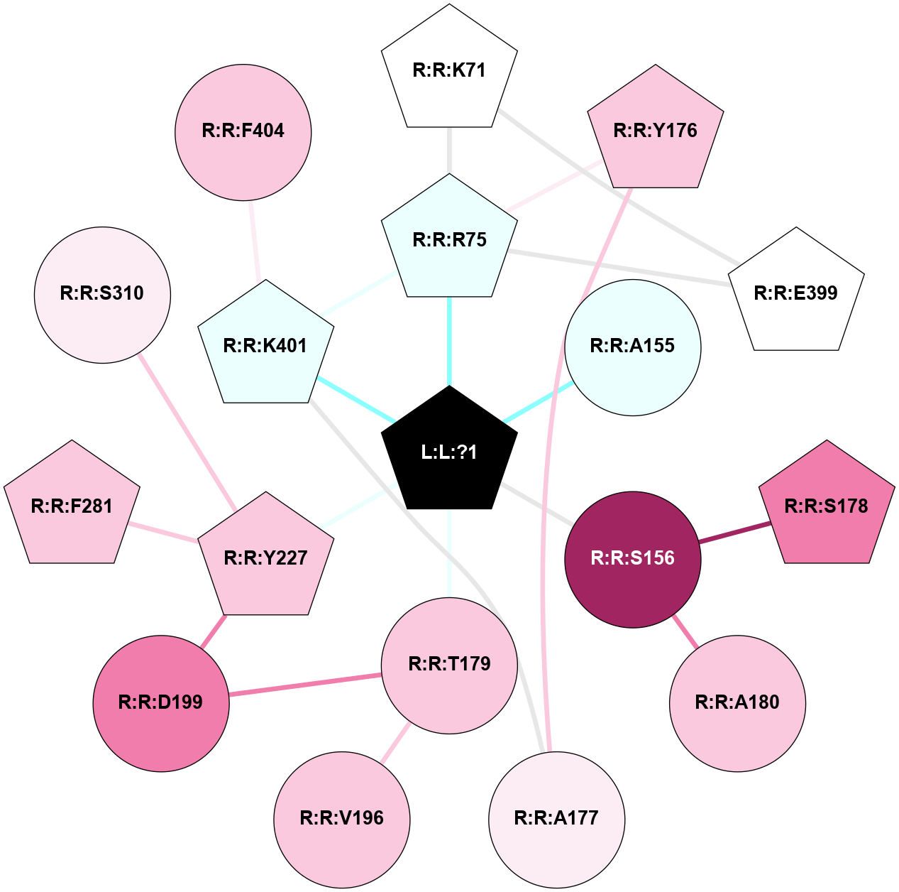 (Click to enlarge 🔍) | | Node1 | Node2 | LinkStrength | Comm | IsNode1Hub? | IsNode2Hub? | Node1Cons | Node2Cons | Node1Shell | Node2Shell | | L:L:?1 | R:R:R75 | 5.81 | 9 | Yes | Yes | 0 | 4 | 0 | 1 | | L:L:?1 | R:R:A155 | 3.23 | 9 | Yes | No | 0 | 4 | 0 | 1 | | L:L:?1 | R:R:S156 | 6.15 | 9 | Yes | No | 0 | 9 | 0 | 1 | | L:L:?1 | R:R:T179 | 8.05 | 9 | Yes | No | 0 | 7 | 0 | 1 | | L:L:?1 | R:R:Y227 | 13.61 | 9 | Yes | Yes | 0 | 7 | 0 | 1 | | L:L:?1 | R:R:K401 | 2.89 | 9 | Yes | Yes | 0 | 4 | 0 | 1 | | R:R:K71 | R:R:R75 | 3.71 | 9 | Yes | Yes | 5 | 4 | 2 | 1 | | R:R:E399 | R:R:K71 | 9.45 | 9 | Yes | Yes | 5 | 5 | 2 | 2 | | R:R:R75 | R:R:Y176 | 11.32 | 9 | Yes | Yes | 4 | 7 | 1 | 2 | | R:R:E399 | R:R:R75 | 12.79 | 9 | Yes | Yes | 5 | 4 | 2 | 1 | | R:R:K401 | R:R:R75 | 7.43 | 9 | Yes | Yes | 4 | 4 | 1 | 1 | | R:R:S156 | R:R:S178 | 4.89 | 0 | No | Yes | 9 | 8 | 1 | 2 | | R:R:A180 | R:R:S156 | 3.42 | 0 | No | No | 7 | 9 | 2 | 1 | | R:R:A177 | R:R:Y176 | 2.67 | 0 | No | Yes | 6 | 7 | 2 | 2 | | R:R:A177 | R:R:K401 | 3.21 | 0 | No | Yes | 6 | 4 | 2 | 1 | | R:R:T179 | R:R:V196 | 4.76 | 0 | No | No | 7 | 7 | 1 | 2 | | R:R:D199 | R:R:T179 | 7.23 | 0 | No | No | 8 | 7 | 2 | 1 | | R:R:D199 | R:R:Y227 | 12.64 | 0 | No | Yes | 8 | 7 | 2 | 1 | | R:R:F281 | R:R:Y227 | 19.6 | 8 | Yes | Yes | 7 | 7 | 2 | 1 | | R:R:S310 | R:R:Y227 | 5.09 | 0 | No | Yes | 6 | 7 | 2 | 1 | | R:R:F404 | R:R:K401 | 7.44 | 0 | No | Yes | 7 | 4 | 2 | 1 | |