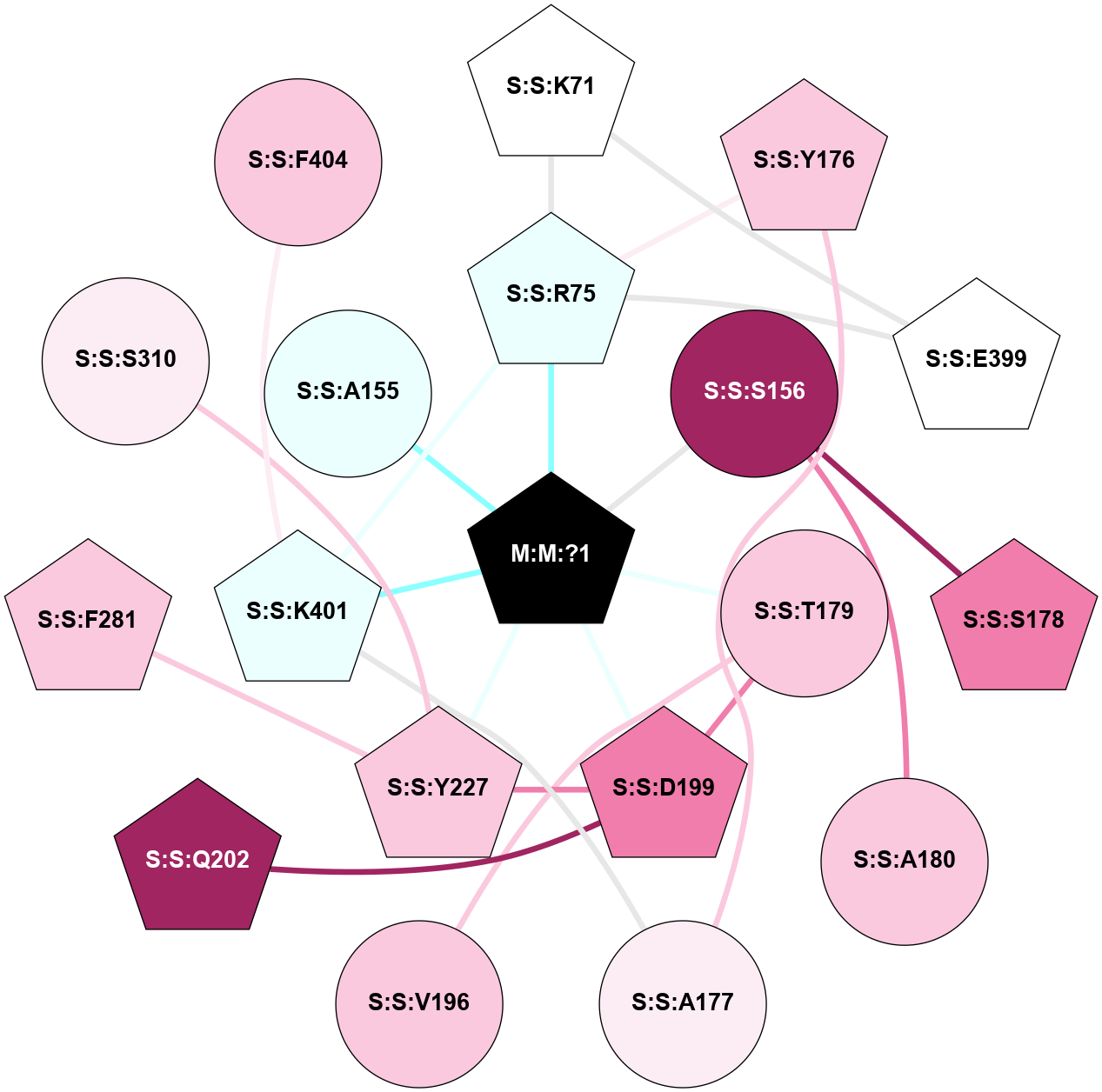 (Click to enlarge 🔍) | | Node1 | Node2 | LinkStrength | Comm | IsNode1Hub? | IsNode2Hub? | Node1Cons | Node2Cons | Node1Shell | Node2Shell | | M:M:?1 | S:S:R75 | 4.15 | 3 | Yes | Yes | 0 | 4 | 0 | 1 | | M:M:?1 | S:S:S156 | 6.15 | 3 | Yes | No | 0 | 9 | 0 | 1 | | M:M:?1 | S:S:T179 | 10.07 | 3 | Yes | No | 0 | 7 | 0 | 1 | | M:M:?1 | S:S:D199 | 2.78 | 3 | Yes | Yes | 0 | 8 | 0 | 1 | | M:M:?1 | S:S:Y227 | 12.01 | 3 | Yes | Yes | 0 | 7 | 0 | 1 | | M:M:?1 | S:S:K401 | 2.89 | 3 | Yes | Yes | 0 | 4 | 0 | 1 | | S:S:K71 | S:S:R75 | 3.71 | 3 | Yes | Yes | 5 | 4 | 2 | 1 | | S:S:E399 | S:S:K71 | 9.45 | 3 | Yes | Yes | 5 | 5 | 2 | 2 | | S:S:R75 | S:S:Y176 | 11.32 | 3 | Yes | Yes | 4 | 7 | 1 | 2 | | S:S:E399 | S:S:R75 | 12.79 | 3 | Yes | Yes | 5 | 4 | 2 | 1 | | S:S:K401 | S:S:R75 | 7.43 | 3 | Yes | Yes | 4 | 4 | 1 | 1 | | S:S:S156 | S:S:S178 | 4.89 | 0 | No | Yes | 9 | 8 | 1 | 2 | | S:S:A180 | S:S:S156 | 3.42 | 0 | No | No | 7 | 9 | 2 | 1 | | S:S:A177 | S:S:Y176 | 2.67 | 0 | No | Yes | 6 | 7 | 2 | 2 | | S:S:A177 | S:S:K401 | 3.21 | 0 | No | Yes | 6 | 4 | 2 | 1 | | S:S:T179 | S:S:V196 | 4.76 | 3 | No | No | 7 | 7 | 1 | 2 | | S:S:D199 | S:S:T179 | 7.23 | 3 | Yes | No | 8 | 7 | 1 | 1 | | S:S:D199 | S:S:Q202 | 2.61 | 3 | Yes | Yes | 8 | 9 | 1 | 2 | | S:S:D199 | S:S:Y227 | 12.64 | 3 | Yes | Yes | 8 | 7 | 1 | 1 | | S:S:F281 | S:S:Y227 | 19.6 | 3 | Yes | Yes | 7 | 7 | 2 | 1 | | S:S:S310 | S:S:Y227 | 5.09 | 0 | No | Yes | 6 | 7 | 2 | 1 | | S:S:F404 | S:S:K401 | 7.44 | 0 | No | Yes | 7 | 4 | 2 | 1 | | M:M:?1 | S:S:A155 | 2.15 | 3 | Yes | No | 0 | 4 | 0 | 1 | |