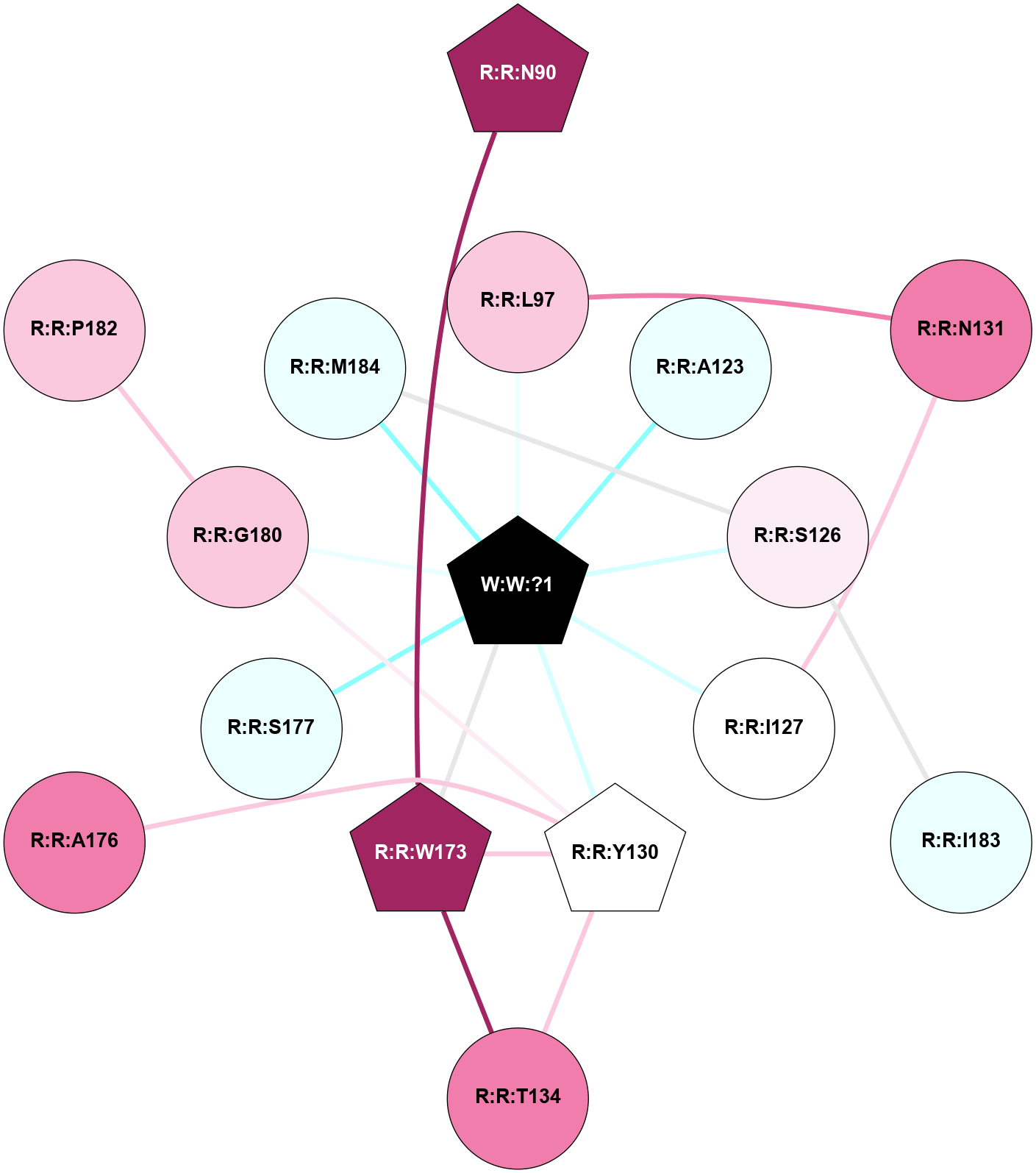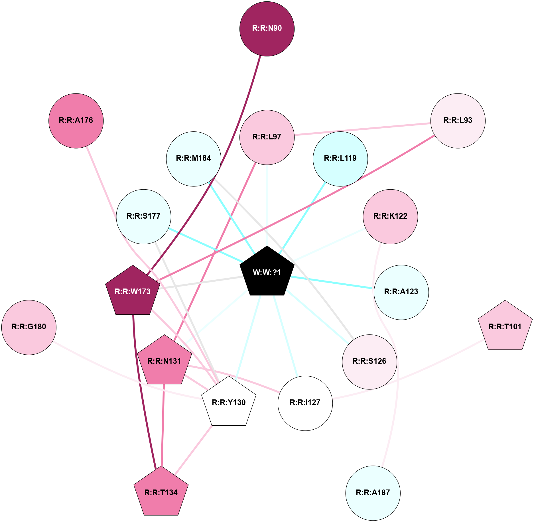(Click to enlarge 🔍) | | Node1 | Node2 | LinkStrength | Comm | IsNode1Hub? | IsNode2Hub? | Node1Cons | Node2Cons | Node1Shell | Node2Shell | | R:R:N90 | R:R:W173 | 3.39 | 8 | Yes | Yes | 9 | 9 | 2 | 1 | | R:R:L97 | R:R:N131 | 13.73 | 0 | No | No | 7 | 8 | 1 | 2 | | R:R:L97 | W:W:?1 | 6.2 | 0 | No | Yes | 7 | 0 | 1 | 0 | | R:R:A123 | W:W:?1 | 11.29 | 0 | No | Yes | 4 | 0 | 1 | 0 | | R:R:I183 | R:R:S126 | 3.1 | 0 | No | No | 4 | 6 | 2 | 1 | | R:R:M184 | R:R:S126 | 7.67 | 8 | No | No | 4 | 6 | 1 | 1 | | R:R:S126 | W:W:?1 | 9.42 | 8 | No | Yes | 6 | 0 | 1 | 0 | | R:R:I127 | R:R:N131 | 5.66 | 0 | No | No | 5 | 8 | 1 | 2 | | R:R:I127 | W:W:?1 | 10.23 | 0 | No | Yes | 5 | 0 | 1 | 0 | | R:R:T134 | R:R:Y130 | 6.24 | 8 | No | Yes | 8 | 5 | 2 | 1 | | R:R:W173 | R:R:Y130 | 9.65 | 8 | Yes | Yes | 9 | 5 | 1 | 1 | | R:R:A176 | R:R:Y130 | 4 | 0 | No | Yes | 8 | 5 | 2 | 1 | | R:R:G180 | R:R:Y130 | 2.9 | 8 | No | Yes | 7 | 5 | 1 | 1 | | R:R:Y130 | W:W:?1 | 27.31 | 8 | Yes | Yes | 5 | 0 | 1 | 0 | | R:R:T134 | R:R:W173 | 18.19 | 8 | No | Yes | 8 | 9 | 2 | 1 | | R:R:W173 | W:W:?1 | 3.06 | 8 | Yes | Yes | 9 | 0 | 1 | 0 | | R:R:S177 | W:W:?1 | 5.38 | 0 | No | Yes | 4 | 0 | 1 | 0 | | R:R:G180 | W:W:?1 | 3.06 | 8 | No | Yes | 7 | 0 | 1 | 0 | | R:R:M184 | W:W:?1 | 10.13 | 8 | No | Yes | 4 | 0 | 1 | 0 | | R:R:G180 | R:R:P182 | 2.03 | 8 | No | No | 7 | 7 | 1 | 2 | |