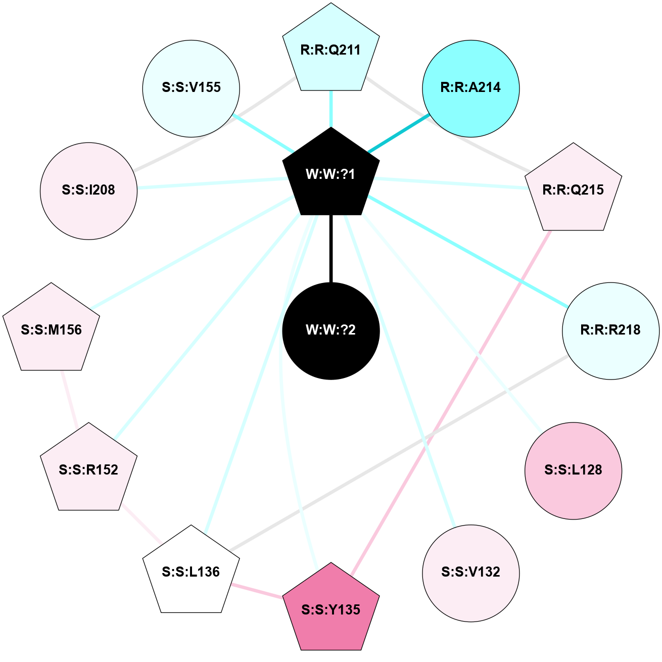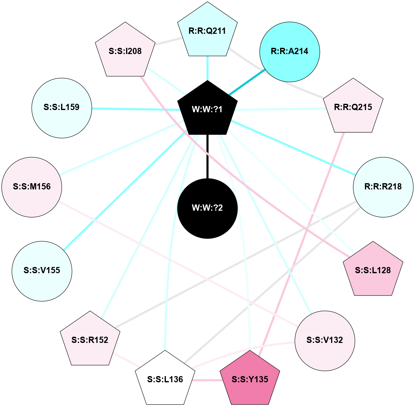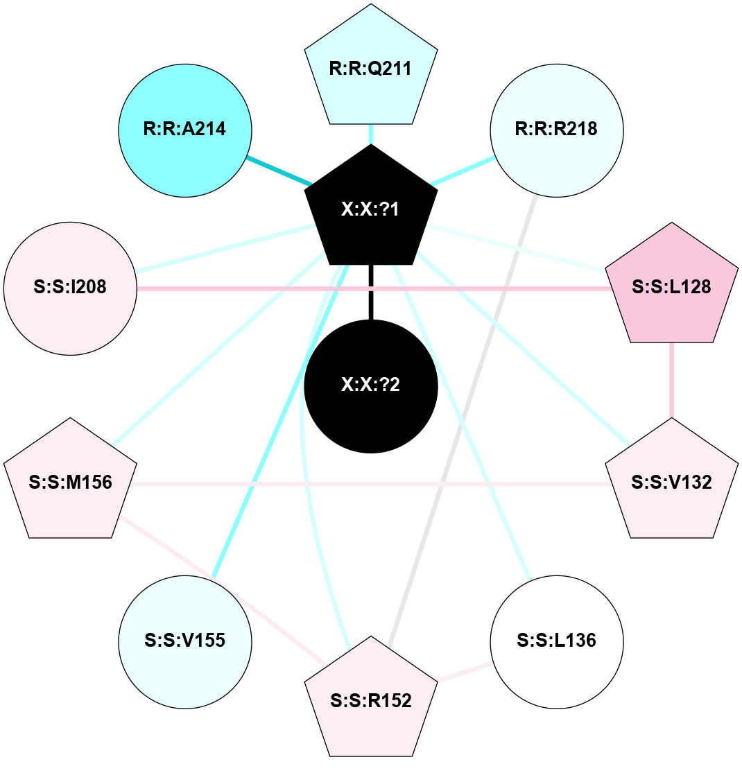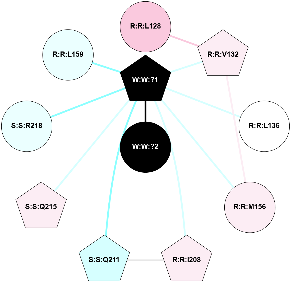 (Click to enlarge 🔍) | | Node1 | Node2 | LinkStrength | Comm | IsNode1Hub? | IsNode2Hub? | Node1Cons | Node2Cons | Node1Shell | Node2Shell | | R:R:L128 | R:R:V132 | 2.98 | 1 | No | Yes | 7 | 6 | 2 | 2 | | R:R:L128 | W:W:?1 | 3.9 | 1 | No | Yes | 7 | 0 | 2 | 1 | | R:R:M156 | R:R:V132 | 3.04 | 1 | No | Yes | 6 | 6 | 2 | 2 | | R:R:V132 | W:W:?1 | 8.4 | 1 | Yes | Yes | 6 | 0 | 2 | 1 | | R:R:L136 | W:W:?1 | 9.76 | 0 | No | Yes | 5 | 0 | 2 | 1 | | R:R:M156 | W:W:?1 | 3.99 | 1 | No | Yes | 6 | 0 | 2 | 1 | | R:R:I208 | S:S:Q211 | 8.23 | 1 | Yes | Yes | 6 | 3 | 2 | 2 | | R:R:I208 | W:W:?1 | 4.03 | 1 | Yes | Yes | 6 | 0 | 2 | 1 | | S:S:Q211 | W:W:?1 | 18.77 | 1 | Yes | Yes | 3 | 0 | 2 | 1 | | S:S:Q215 | W:W:?1 | 9.38 | 1 | Yes | Yes | 6 | 0 | 2 | 1 | | S:S:R218 | W:W:?1 | 10.28 | 0 | No | Yes | 4 | 0 | 2 | 1 | | W:W:?1 | W:W:?2 | 13.76 | 1 | Yes | No | 0 | 0 | 1 | 0 | | R:R:L159 | W:W:?1 | 1.95 | 0 | No | Yes | 4 | 0 | 2 | 1 | |