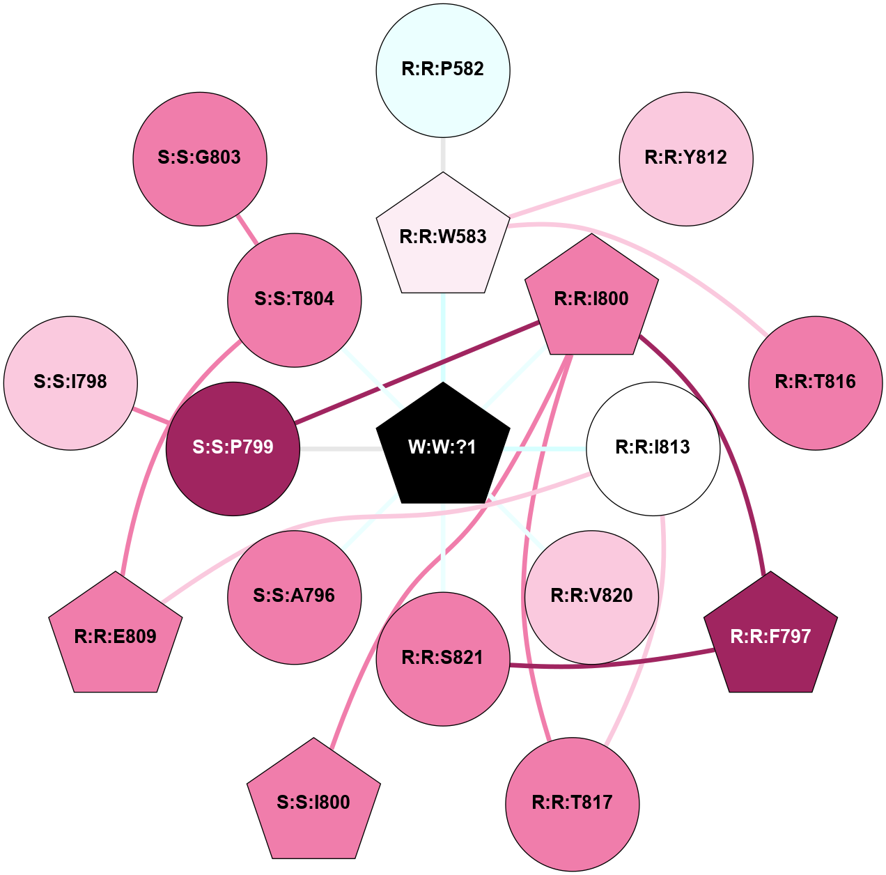 (Click to enlarge 🔍) | | Node1 | Node2 | LinkStrength | Comm | IsNode1Hub? | IsNode2Hub? | Node1Cons | Node2Cons | Node1Shell | Node2Shell | | R:R:P582 | R:R:W583 | 2.7 | 0 | No | Yes | 4 | 6 | 2 | 1 | | R:R:W583 | R:R:Y812 | 4.82 | 0 | Yes | No | 6 | 7 | 1 | 2 | | R:R:T816 | R:R:W583 | 3.64 | 0 | No | Yes | 8 | 6 | 2 | 1 | | R:R:W583 | W:W:?1 | 9.32 | 0 | Yes | Yes | 6 | 0 | 1 | 0 | | R:R:F797 | R:R:I800 | 3.77 | 0 | Yes | Yes | 9 | 8 | 2 | 1 | | R:R:F797 | R:R:S821 | 6.61 | 0 | Yes | No | 9 | 8 | 2 | 1 | | R:R:I800 | R:R:T817 | 3.04 | 9 | Yes | No | 8 | 8 | 1 | 2 | | R:R:I800 | S:S:P799 | 5.08 | 9 | Yes | No | 8 | 9 | 1 | 1 | | R:R:I800 | S:S:I800 | 4.42 | 9 | Yes | Yes | 8 | 8 | 1 | 2 | | R:R:I800 | W:W:?1 | 18.99 | 9 | Yes | Yes | 8 | 0 | 1 | 0 | | R:R:E809 | R:R:I813 | 2.73 | 0 | Yes | No | 8 | 5 | 2 | 1 | | R:R:E809 | S:S:T804 | 7.06 | 0 | Yes | No | 8 | 8 | 2 | 1 | | R:R:I813 | R:R:T817 | 3.04 | 0 | No | No | 5 | 8 | 1 | 2 | | R:R:I813 | W:W:?1 | 4.38 | 0 | No | Yes | 5 | 0 | 1 | 0 | | R:R:V820 | W:W:?1 | 10.67 | 0 | No | Yes | 7 | 0 | 1 | 0 | | R:R:S821 | W:W:?1 | 12.29 | 0 | No | Yes | 8 | 0 | 1 | 0 | | S:S:A796 | W:W:?1 | 3.22 | 0 | No | Yes | 8 | 0 | 1 | 0 | | S:S:I798 | S:S:P799 | 5.08 | 0 | No | No | 7 | 9 | 2 | 1 | | S:S:P799 | W:W:?1 | 15.12 | 9 | No | Yes | 9 | 0 | 1 | 0 | | S:S:T804 | W:W:?1 | 4.52 | 0 | No | Yes | 8 | 0 | 1 | 0 | | S:S:G803 | S:S:T804 | 1.82 | 0 | No | No | 8 | 8 | 2 | 1 | |
