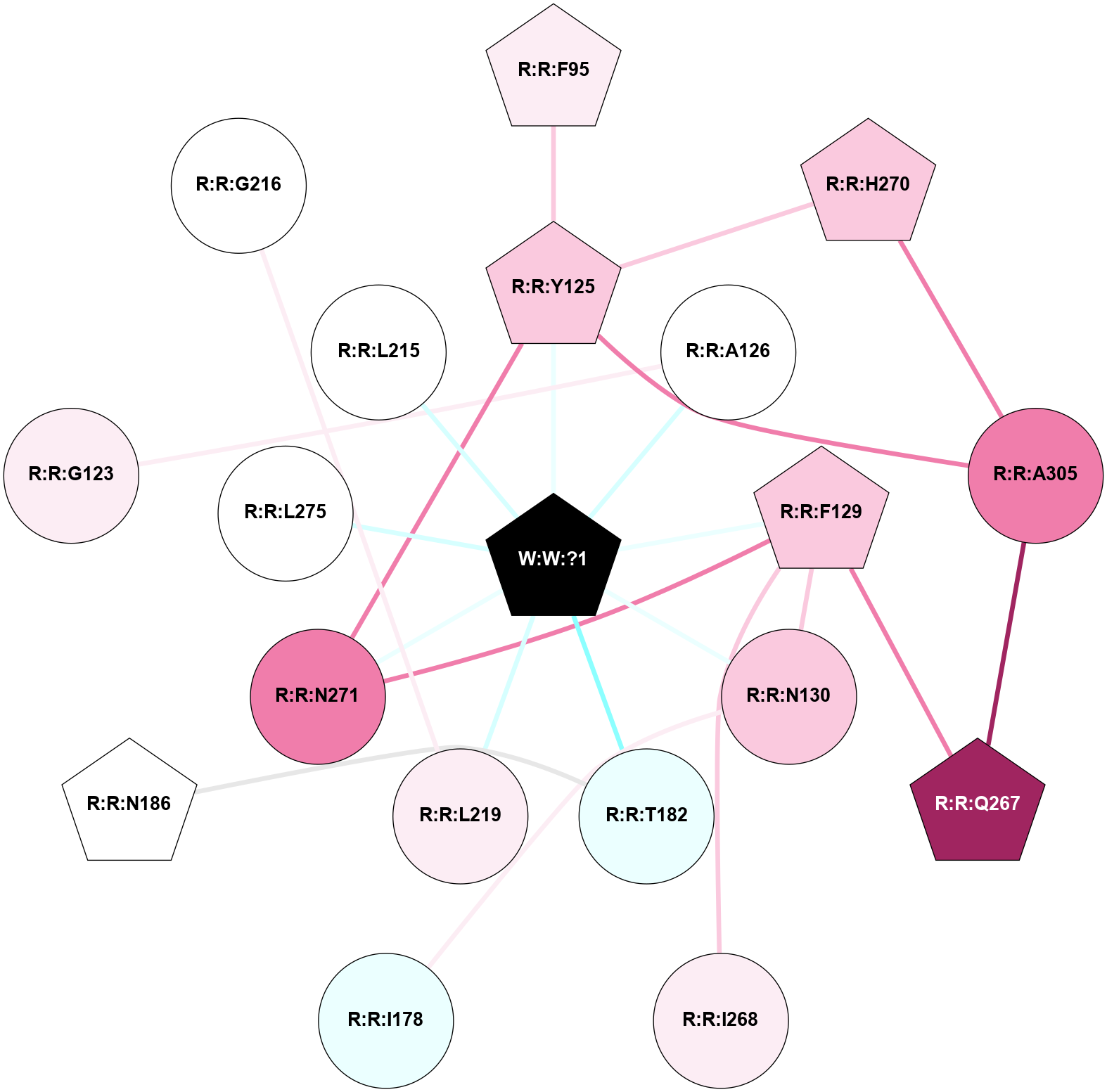 (Click to enlarge 🔍) | | Node1 | Node2 | LinkStrength | Comm | IsNode1Hub? | IsNode2Hub? | Node1Cons | Node2Cons | Node1Shell | Node2Shell | | R:R:F95 | R:R:Y125 | 5.16 | 0 | Yes | Yes | 6 | 7 | 2 | 1 | | R:R:H270 | R:R:Y125 | 8.71 | 1 | Yes | Yes | 7 | 7 | 2 | 1 | | R:R:N271 | R:R:Y125 | 4.65 | 1 | No | Yes | 8 | 7 | 1 | 1 | | R:R:A305 | R:R:Y125 | 4 | 1 | No | Yes | 8 | 7 | 2 | 1 | | R:R:Y125 | W:W:?1 | 4.4 | 1 | Yes | Yes | 7 | 0 | 1 | 0 | | R:R:A126 | W:W:?1 | 4.73 | 0 | No | Yes | 5 | 0 | 1 | 0 | | R:R:F129 | R:R:N130 | 6.04 | 1 | Yes | No | 7 | 7 | 1 | 1 | | R:R:F129 | R:R:Q267 | 9.37 | 1 | Yes | Yes | 7 | 9 | 1 | 2 | | R:R:F129 | R:R:I268 | 5.02 | 1 | Yes | No | 7 | 6 | 1 | 2 | | R:R:F129 | R:R:N271 | 3.62 | 1 | Yes | No | 7 | 8 | 1 | 1 | | R:R:F129 | W:W:?1 | 14.64 | 1 | Yes | Yes | 7 | 0 | 1 | 0 | | R:R:I178 | R:R:N130 | 21.24 | 0 | No | No | 4 | 7 | 2 | 1 | | R:R:N130 | W:W:?1 | 11.35 | 1 | No | Yes | 7 | 0 | 1 | 0 | | R:R:N186 | R:R:T182 | 4.39 | 0 | Yes | No | 5 | 4 | 2 | 1 | | R:R:T182 | W:W:?1 | 6.64 | 0 | No | Yes | 4 | 0 | 1 | 0 | | R:R:L219 | W:W:?1 | 9.36 | 0 | No | Yes | 6 | 0 | 1 | 0 | | R:R:A305 | R:R:Q267 | 4.55 | 1 | No | Yes | 8 | 9 | 2 | 2 | | R:R:A305 | R:R:H270 | 4.39 | 1 | No | Yes | 8 | 7 | 2 | 2 | | R:R:N271 | W:W:?1 | 26.82 | 1 | No | Yes | 8 | 0 | 1 | 0 | | R:R:L275 | W:W:?1 | 11.44 | 0 | No | Yes | 5 | 0 | 1 | 0 | | R:R:L215 | W:W:?1 | 3.12 | 0 | No | Yes | 5 | 0 | 1 | 0 | | R:R:A126 | R:R:G123 | 1.95 | 0 | No | No | 5 | 6 | 1 | 2 | | R:R:G216 | R:R:L219 | 1.71 | 0 | No | No | 5 | 6 | 2 | 1 | |
