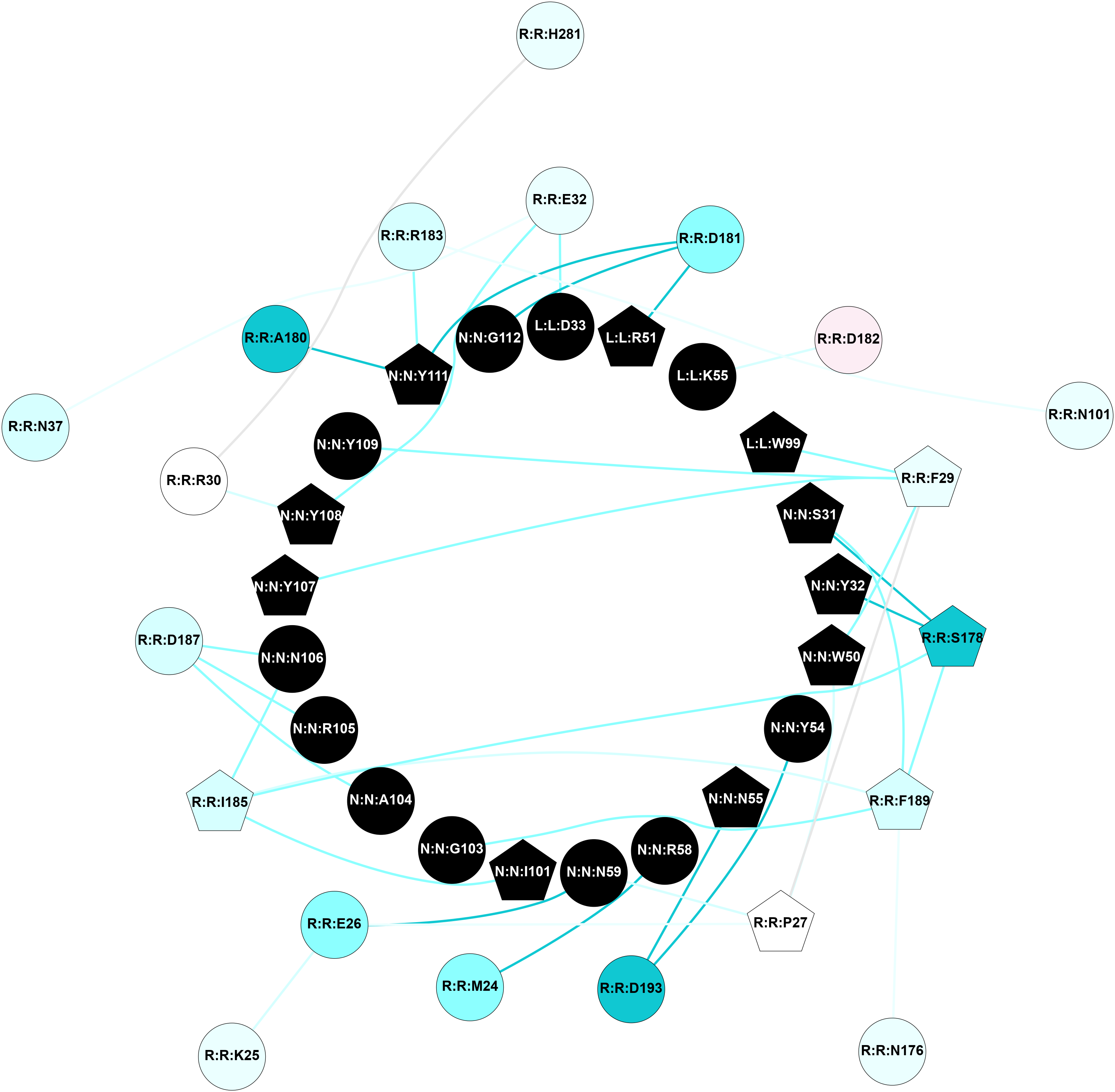 Links and nodes colored according to ConSurf Conservation Grade (See documentation): n/a 1 2 3 4 5 6 7 8 9 |