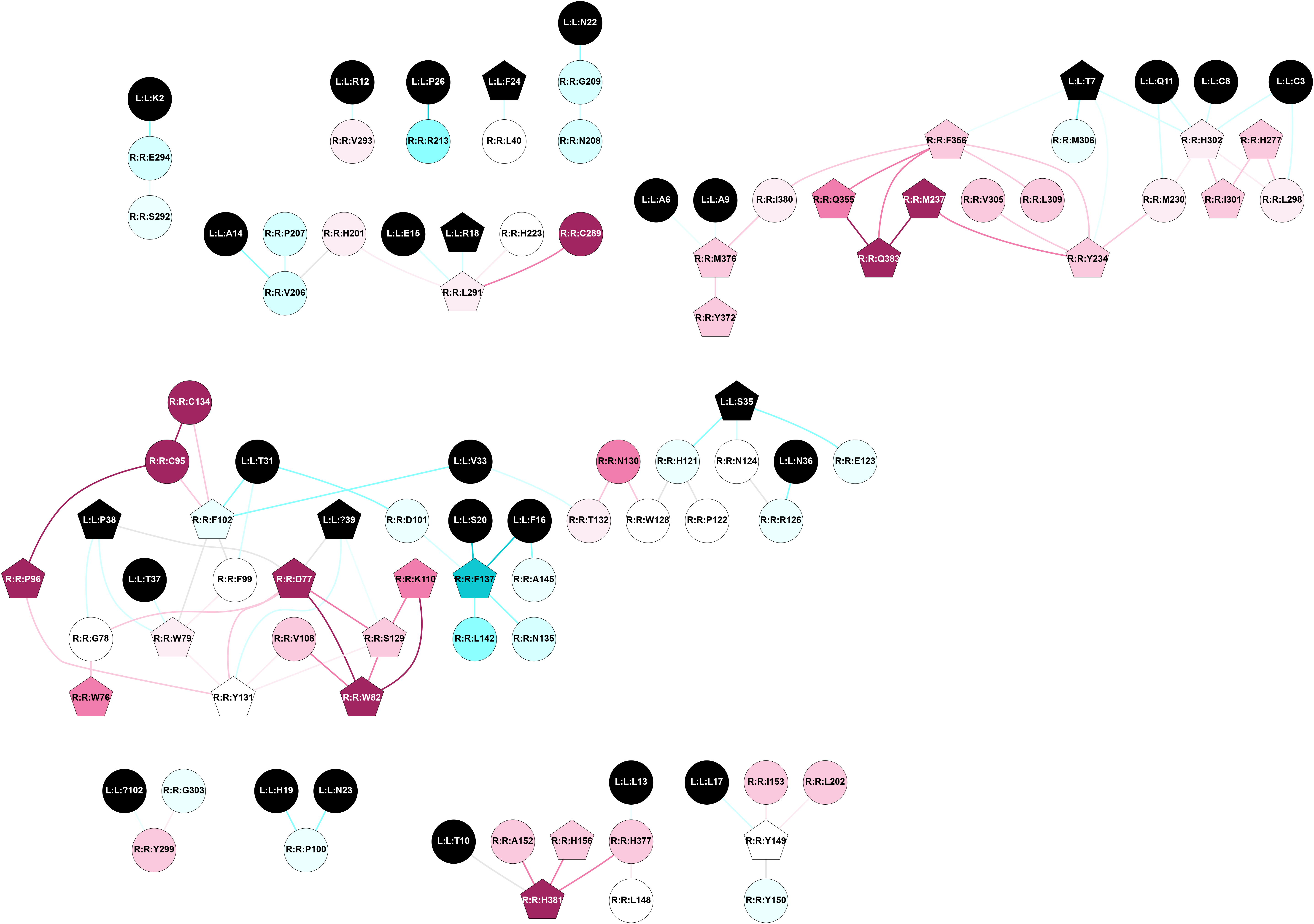 | Index | Node1 | Node2 | Int. Strength | Hub1? | Hub2? | Community | ConSurf1 | ConSurf2 |