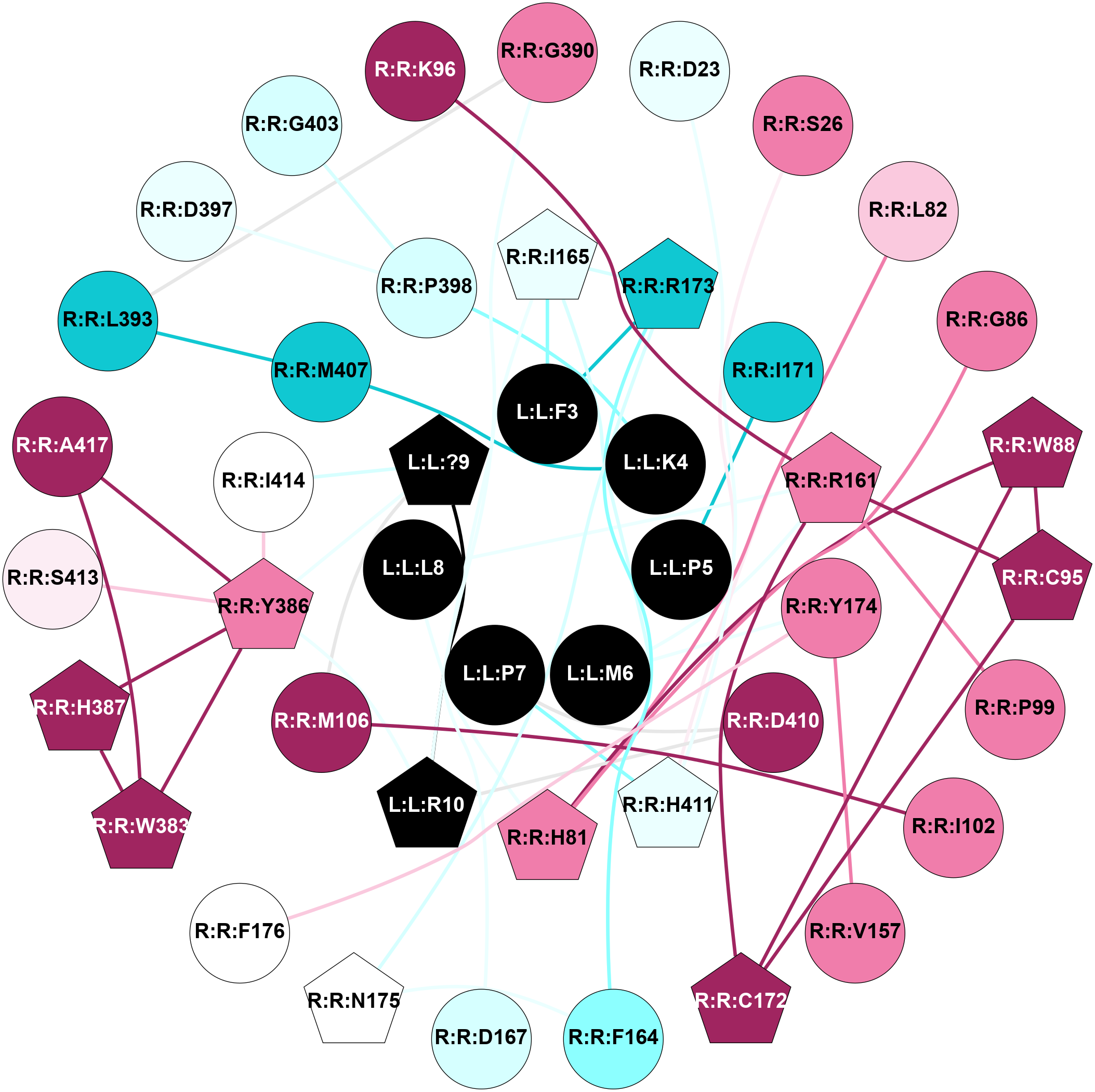 Links and nodes colored according to ConSurf Conservation Grade (See documentation): n/a 1 2 3 4 5 6 7 8 9 |